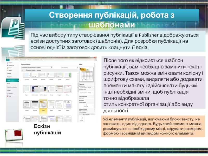 Publisher відображуються ескізи доступних заготовок (шаблонів). Для розробки публікації на основі однієї із заготовок досить клацнути її ескіз.