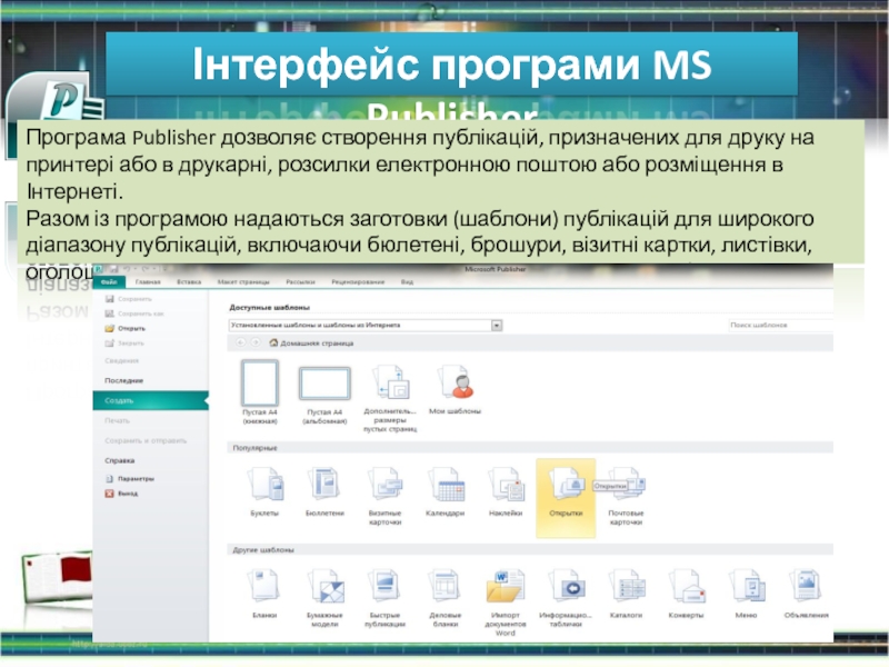 Програма Publisher дозволяє створення публікацій, призначених для друку