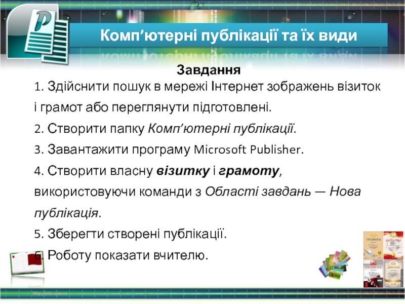 1. Здійснити пошук в мережі Інтернет зображень візиток і грамот або