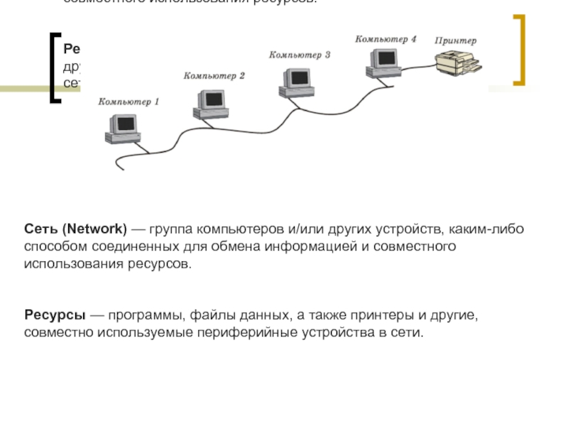 Ресурсы — программы, файлы данных, а также принтеры и другие, совместно используемые периферийные устройства в сети.
