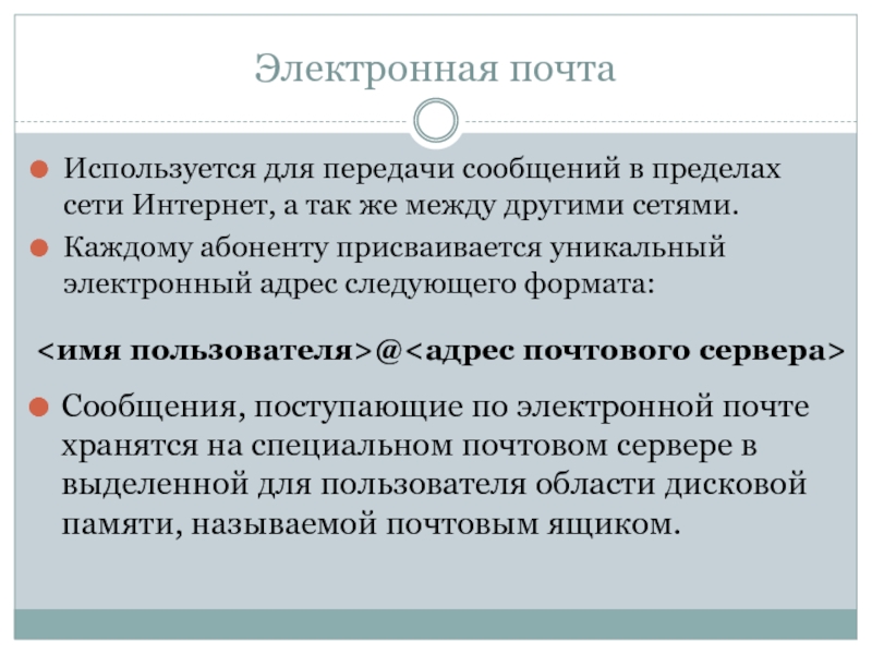 Сообщения, поступающие по электронной почте хранятся на специальном почтовом сервере в выделенной для пользователя области дисковой памяти, называемой почтовым ящиком.