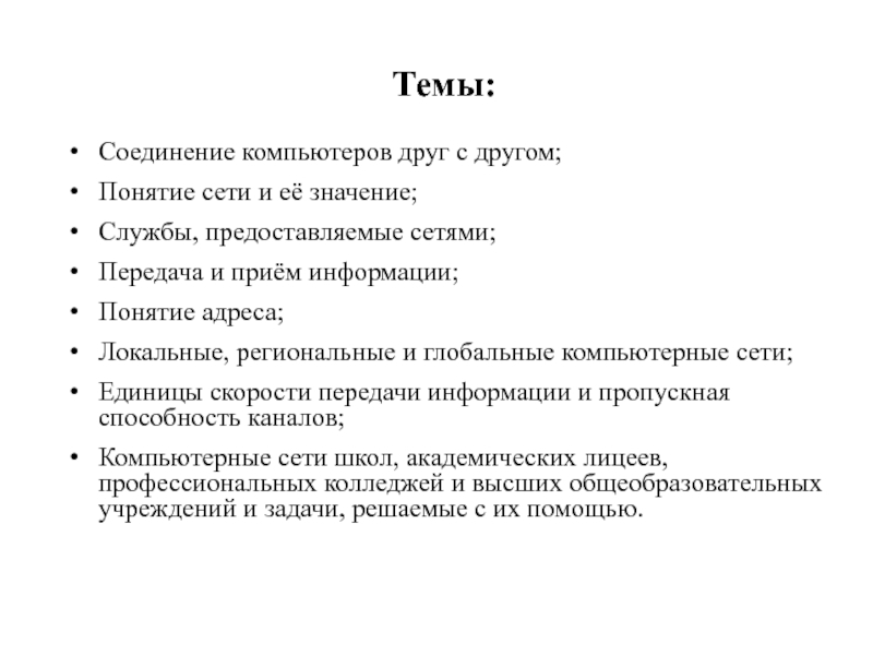 Региональные сети – соединение компьютеров и локальных сетей, находящихся в одной стране, в одном городе или районе с помощью специальных или телекоммуникационных каналов связи. Глобальные сети – соединение региональных и локальных сетей, абонентов, компьютеров в одну всемирную сеть при помощи телекоммуникационных связей (кабельное, беспроводное, используя искусственные спутники).