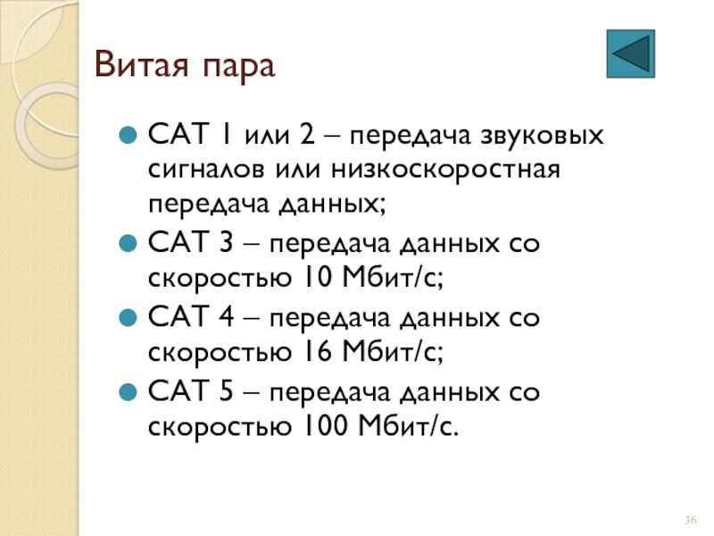 Одновременно работают только две станции, соединенные физически через центральное устройство. Реализуется с помощью кабеля «витая пара».