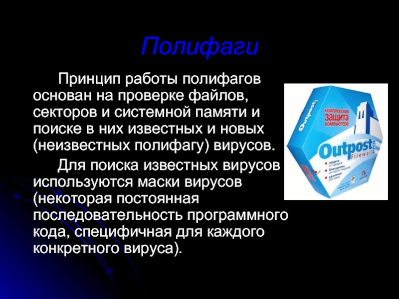Их очень тяжело обнаружить из-за применения в них алгоритмов шифрования. Каждая следующая копия размножающегося вируса не будет похожа на предыдущую.