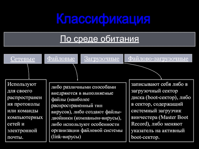 либо различными способами внедряются в выполняемые файлы (наиболее распространенный тип вирусов), либо создают файлы-двойники (компаньон-вирусы), либо используют особенности организации файловой системы (link-вирусы)
