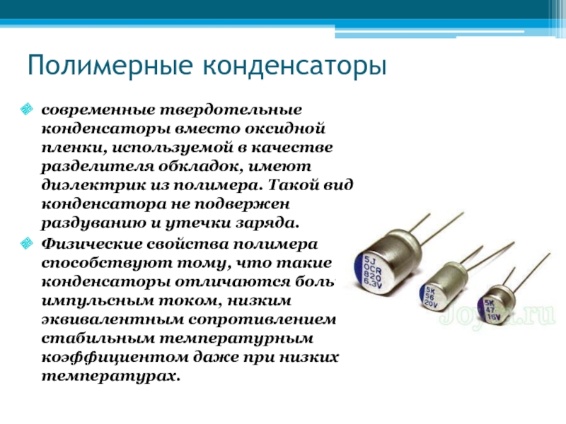 обкладок, имеют диэлектрик из полимера. Такой вид конденсатора не подвержен раздуванию и утечки заряда.