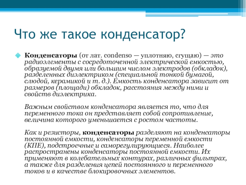 Конденсаторы (от лат. condenso — уплотняю, сгущаю) — это