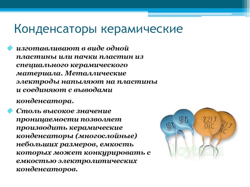 керамического материала. Металлические электроды напыляют на пластины и соединяют с выводами конденсатора.