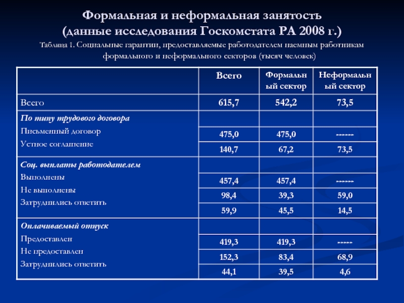 Слайд 7Таблица 4. Занятые в несельскохоз. сфере по формальной и неформальной