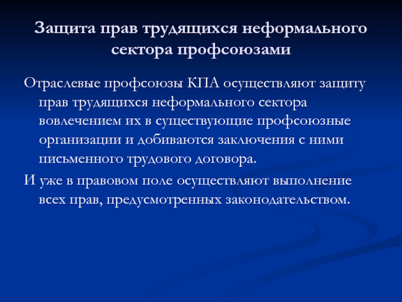 Слайд 9Защита прав трудящихся неформального сектора профсоюзами