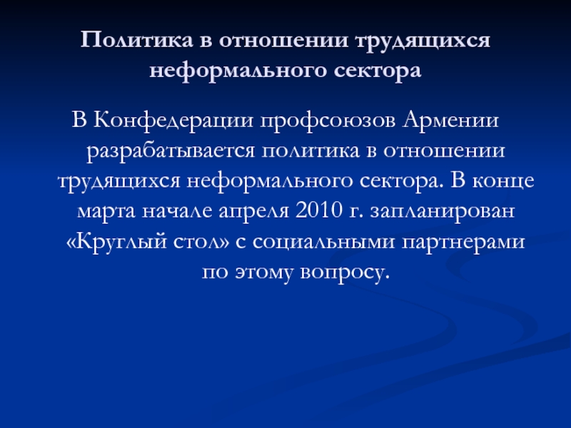 в отношении трудящихся неформального сектора. В конце марта начале апреля 2010 г. запланирован «Круглый стол» с социальными партнерами по этому вопросу.