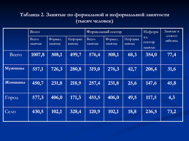 Слайд 5Таблица 2. Занятые по формальной и неформальной занятости (тысяч человек)