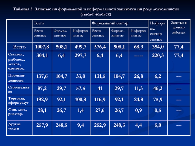 Слайд 6Таблица 3. Занятые по формальной и неформальной занятости по роду деятельности