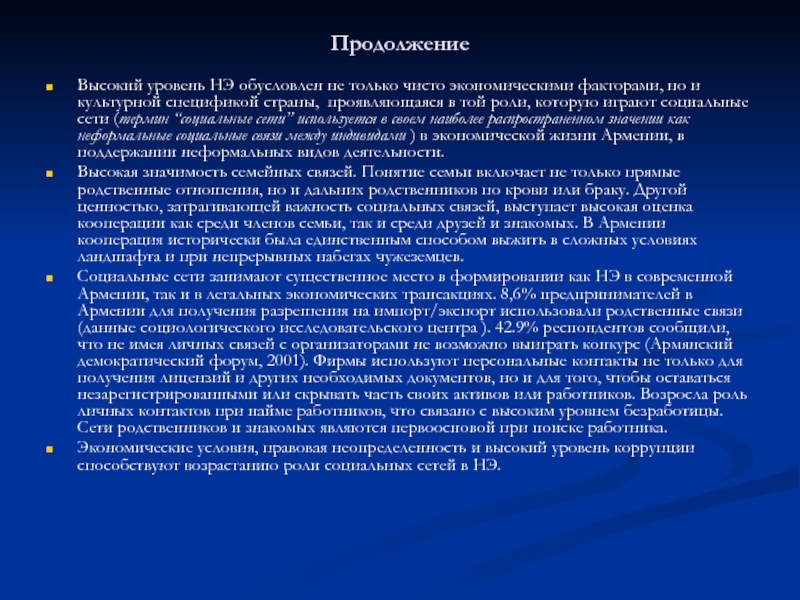 культурной спецификой страны, проявляющаяся в той роли, которую играют социальные сети (термин “социальные сети” используется в своем наиболее распространенном значении как неформальные социальные связи между индивидами ) в экономической жизни Армении, в поддержании неформальных видов деятельности.