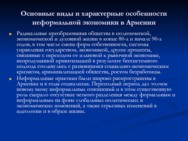 Слайд 2Основные виды и характерные особенности неформальной экономики в Армении