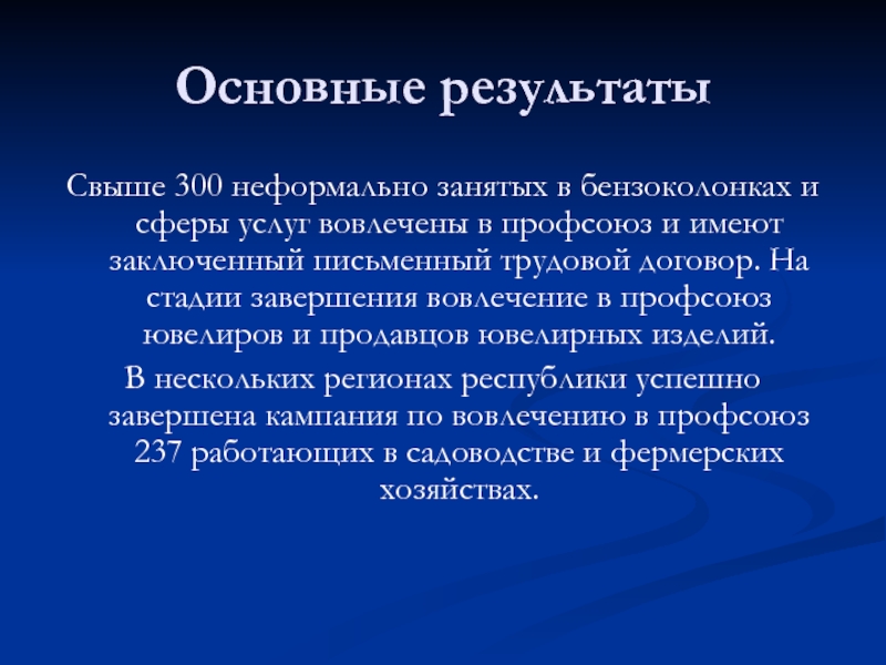 трудящихся неформального сектора вовлечением их в существующие профсоюзные организации и добиваются заключения с ними письменного трудового договора.