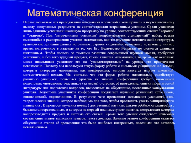 неутешительному выводу: полученные результаты не соответствовали затраченным усилиям. Среди учащихся лишь единицы усваивали школьную программу на уровне, соответствующим оценке "хорошо" и "отлично". Под "затраченными усилиями" подразумевается стандартный* набор, всегда имеющийся в распоряжении учителя математики, как-то: изучение методической литературы, привлечение дополнительных источников, строгое следование программе и, наконец, личное время, потраченное в надежде на то, что Его Величество Результат не окажется слишком ничтожным. Чтобы поспеть за темпами развития современной научной мысли, требуются усложнить, и без того трудный предмет, каким является математика, в то время как основная масса школьников усваивает его на "удовлетворительно" на уроках это практически невозможно. Поэтому мы используем такую форму работы с сильными учащимися и с детьми, которым интересно математика, как конференция, которая является итогом школьной математической недели. Мы считаем, что эта форма работы максимально содействует развитию учащихся, повышает уровень их знаний. Конференция требует тщательной подготовки: оповещение участников (за месяц) о строках её проведение, списки предлагаемой литературы для подготовки вопросов, выносимых на обсуждение, постоянные консультации учителя. Подготовка участников конференции предлагает изучение различных источников, энциклопедий, справочников. В результате чего происходит повышение удельного веса теоретических знаний, которое необходимо для того, чтобы преодолеть узость эмпирического мышления . В процессе изучения новых ( для ученика) научных фактов ребёнок сталкивается с бывшим опосредованным, в котором на первый план выступает понятие, посредствам которых воспроизводится предмет и системе его связей. Кроме того ученик овладевает навыками составления планов написания тезисов, текста доклада. Важным этапом конференции является обсуждение этапов её проведения: что было наиболее интересным, полезным: что осталось невыясненным.