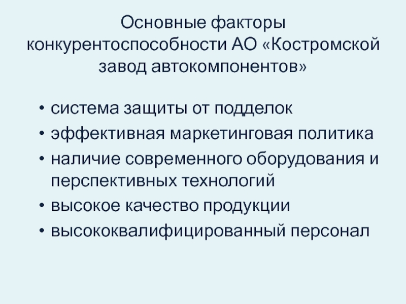 Слайд 3Основные факторы конкурентоспособности АО «Костромской завод автокомпонентов»