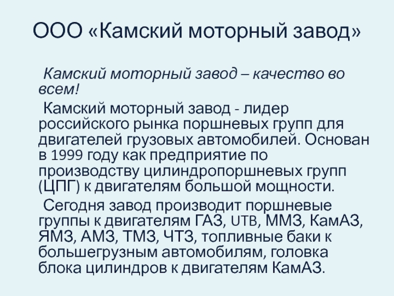 моторный завод - лидер российского рынка поршневых групп для двигателей грузовых автомобилей. Основан в 1999 году как предприятие по производству цилиндропоршневых групп (ЦПГ) к двигателям большой мощности.