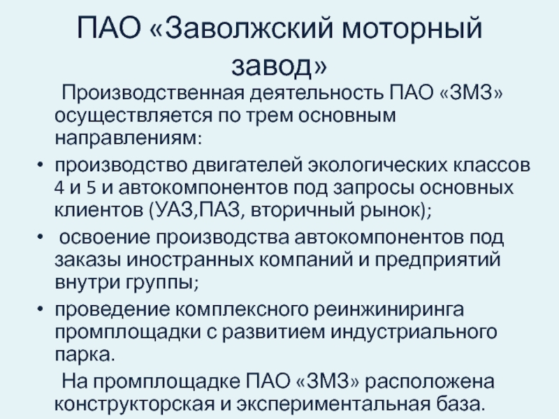 Производственная деятельность ПАО «ЗМЗ» осуществляется по трем основным