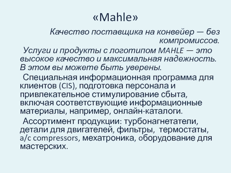 Ассортимент продукции: турбонагнетатели, детали для двигателей, фильтры, термостаты, a/c compressors, мехатроника, oборудование для мастерских.