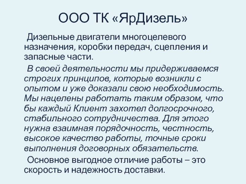 В своей деятельности мы придерживаемся строгих принципов, которые возникли с опытом и уже доказали свою необходимость. Мы нацелены работать таким образом, что бы каждый Клиент захотел долгосрочного, стабильного сотрудничества. Для этого нужна взаимная порядочность, честность, высокое качество работы, точные сроки выполнения договорных обязательств.