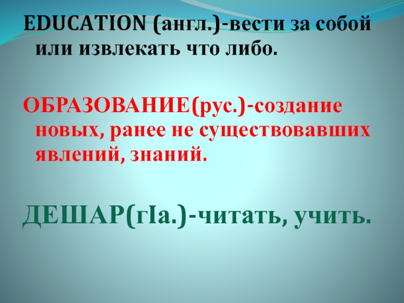 Слайд 9EDUCATION (англ.)-вести за собой или извлекать что либо.