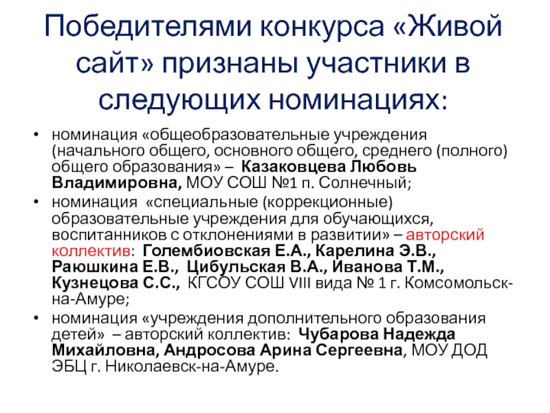 Слайд 11Победителями конкурса «Живой сайт» признаны участники в следующих номинациях: