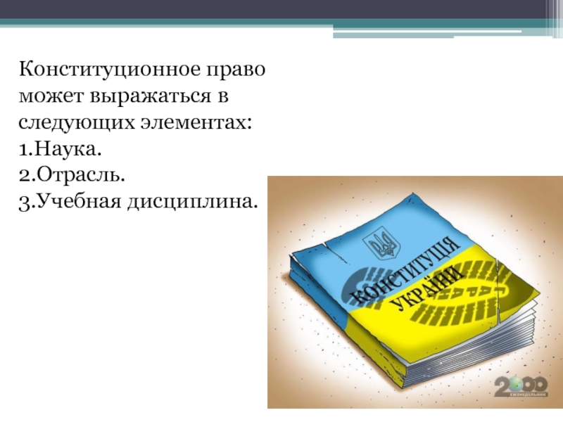 Слайд 5Конституционное право может выражаться в следующих элементах: