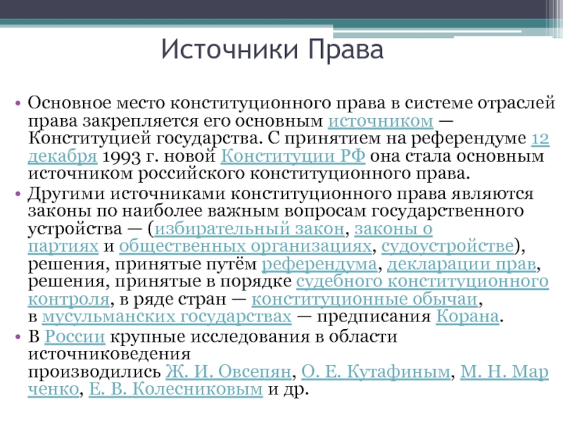 его основным источником — Конституцией государства. С принятием на референдуме 12 декабря 1993 г. новой Конституции РФ она стала основным источником российского конституционного права.
