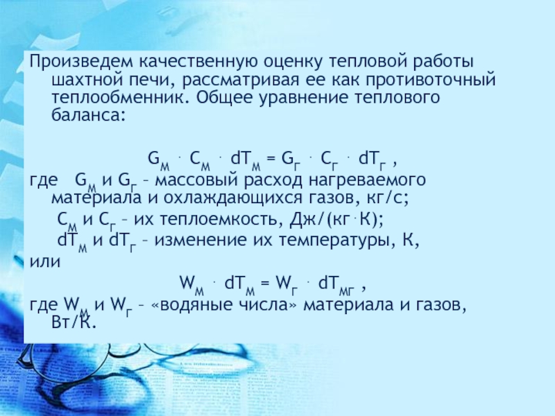 Слайд 21Произведем качественную оценку тепловой работы шахтной печи, рассматривая ее как противоточный