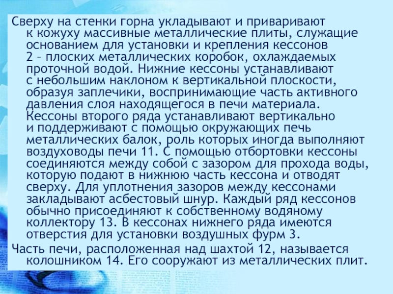 к кожуху массивные металлические плиты, служащие основанием для установки и крепления кессонов 2 – плоских металлических коробок, охлаждаемых проточной водой. Нижние кессоны устанавливают с небольшим наклоном к вертикальной плоскости, образуя заплечики, воспринимающие часть активного давления слоя находящегося в печи материала. Кессоны второго ряда устанавливают вертикально и поддерживают с помощью окружающих печь металлических балок, роль которых иногда выполняют воздуховоды печи 11. С помощью отбортовки кессоны соединяются между собой с зазором для прохода воды, которую подают в нижнюю часть кессона и отводят сверху. Для уплотнения зазоров между кессонами закладывают асбестовый шнур. Каждый ряд кессонов обычно присоединяют к собственному водяному коллектору 13. В кессонах нижнего ряда имеются отверстия для установки воздушных фурм 3.