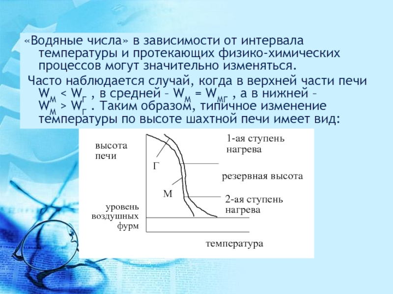 Часто наблюдается случай, когда в верхней части печи WМ < WГ , в средней – WМ = WМГ , а в нижней – WМ > WГ . Таким образом, типичное изменение температуры по высоте шахтной печи имеет вид: