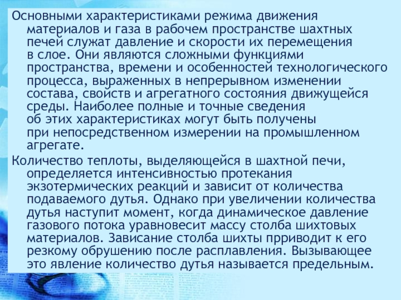 Слайд 20Основными характеристиками режима движения материалов и газа в рабочем пространстве шахтных