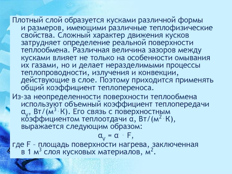 и размеров, имеющими различные теплофизические свойства. Сложный характер движения кусков затрудняет определение реальной поверхности теплообмена. Различная величина зазоров между кусками влияет не только на особенности омывания их газами, но и делает неразделимыми процессы теплопроводности, излучения и конвекции, действующие в слое. Поэтому приходится применять общий коэффициент теплопереноса.