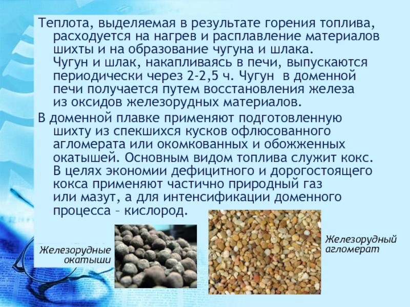 В доменной плавке применяют подготовленную шихту из спекшихся кусков офлюсованного агломерата или окомкованных и обожженных окатышей. Основным видом топлива служит кокс. В целях экономии дефицитного и дорогостоящего кокса применяют частично природный газ или мазут, а для интенсификации доменного процесса – кислород.