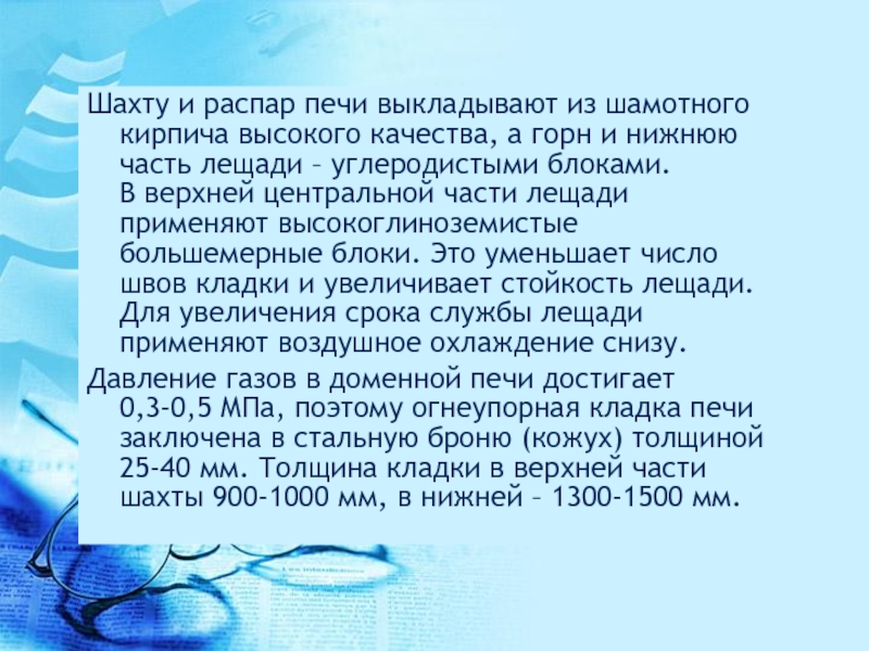 Слайд 8Шахту и распар печи выкладывают из шамотного кирпича высокого качества, а