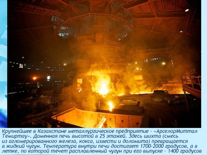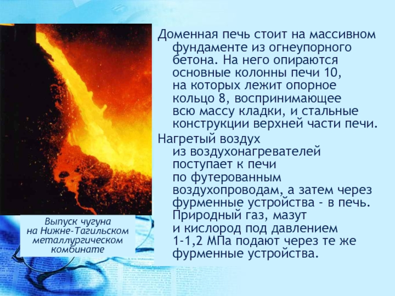 Слайд 10Доменная печь стоит на массивном фундаменте из огнеупорного бетона. На него