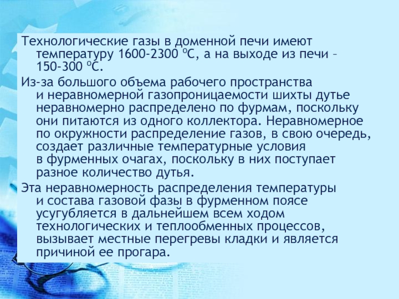 Слайд 28Технологические газы в доменной печи имеют температуру 1600-2300 оС, а на