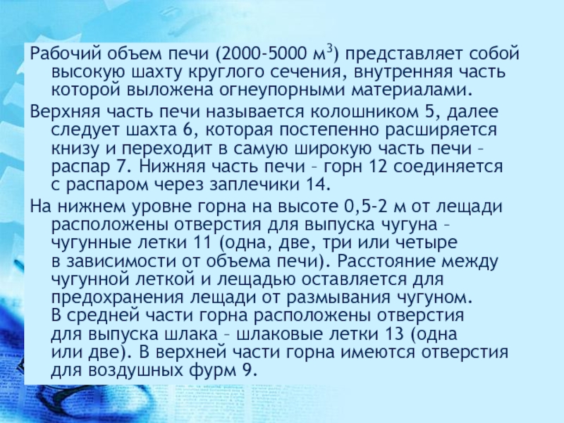 Слайд 7Рабочий объем печи (2000-5000 м3) представляет собой высокую шахту круглого сечения,