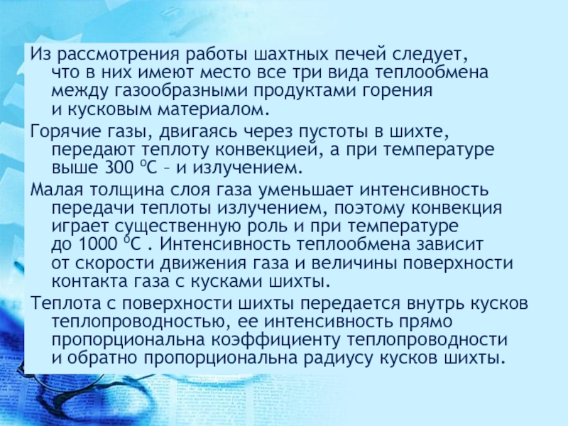 Горячие газы, двигаясь через пустоты в шихте, передают теплоту конвекцией, а при температуре выше 300 оС – и излучением.