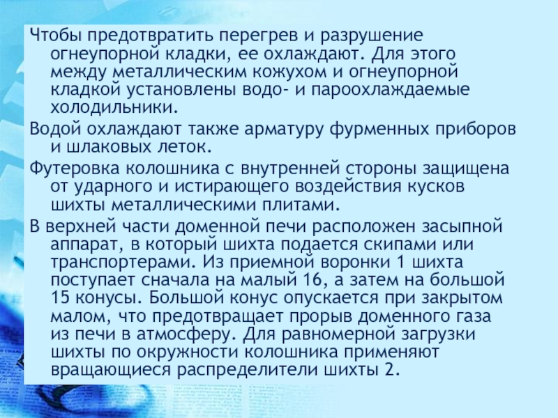 Слайд 9Чтобы предотвратить перегрев и разрушение огнеупорной кладки, ее охлаждают. Для этого