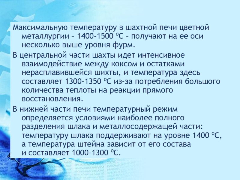 Слайд 29Максимальную температуру в шахтной печи цветной металлургии – 1400-1500 оС –