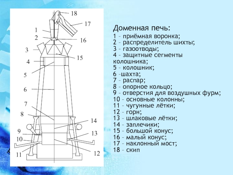 В верхней части доменной печи расположен засыпной аппарат, в который шихта подается скипами или транспортерами. Из приемной воронки 1 шихта поступает сначала на малый 16, а затем на большой 15 конусы. Большой конус опускается при закрытом малом, что предотвращает прорыв доменного газа из печи в атмосферу. Для равномерной загрузки шихты по окружности колошника применяют вращающиеся распределители шихты 2.