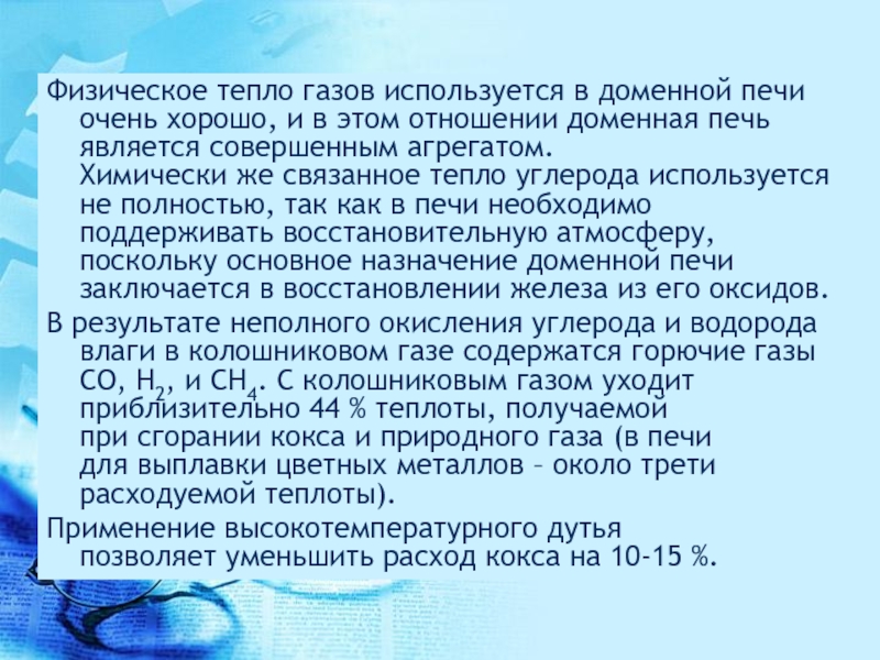 Слайд 24Физическое тепло газов используется в доменной печи очень хорошо, и в