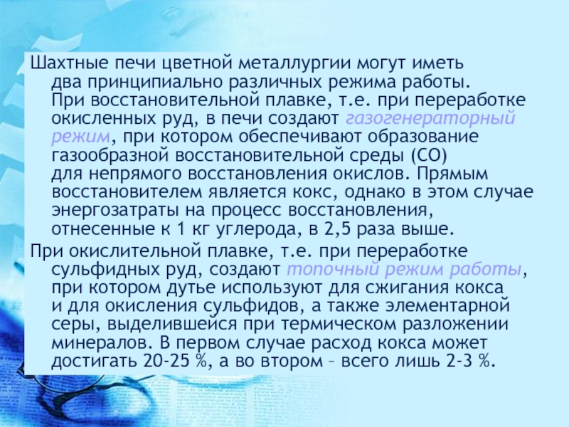 При окислительной плавке, т.е. при переработке сульфидных руд, создают топочный режим работы, при котором дутье используют для сжигания кокса и для окисления сульфидов, а также элементарной серы, выделившейся при термическом разложении минералов. В первом случае расход кокса может достигать 20-25 %, а во втором – всего лишь 2-3 %.