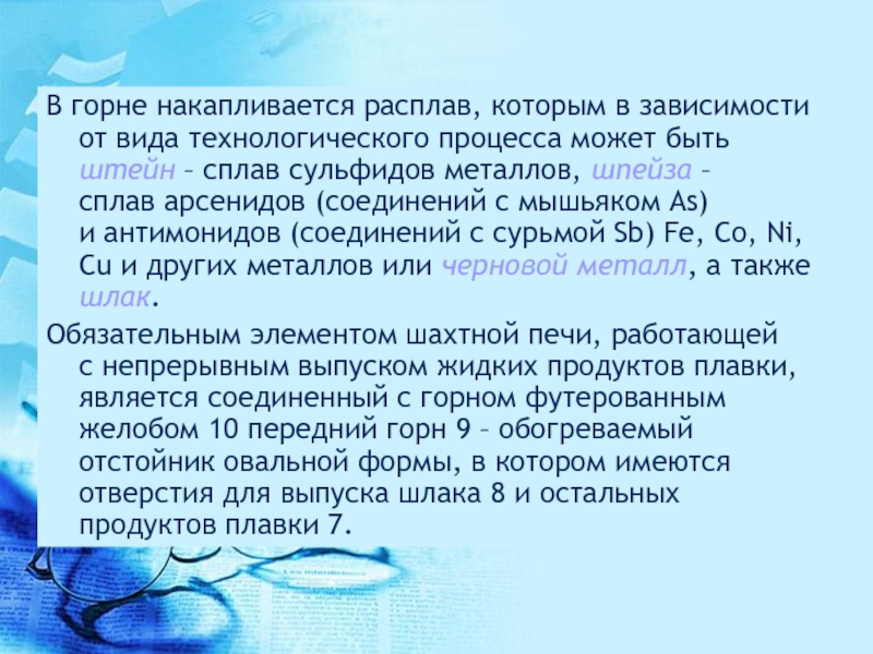 Слайд 17В горне накапливается расплав, которым в зависимости от вида технологического процесса
