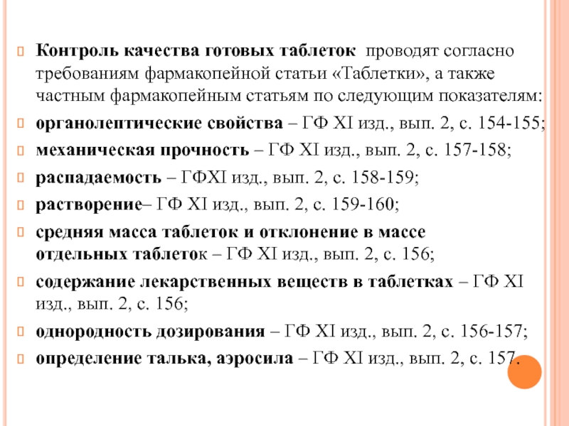 Слайд 5Контроль качества готовых таблеток проводят согласно требованиям фармакопейной статьи «Таблетки», а также частным фармакопейным статьям по