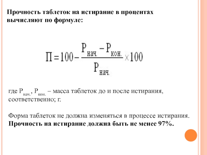 Слайд 19Прочность таблеток на истирание в процентах вычисляют по формуле: