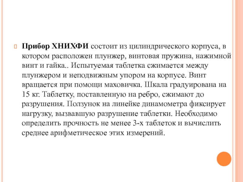 пружина, нажимной винт и гайка.. Испытуемая таблетка сжимается между плунжером и неподвижным упором на корпусе. Винт вращается при помощи маховичка. Шкала градуирована на 15 кг. Таблетку, поставленную на ребро, сжимают до разрушения. Ползунок на линейке динамометра фиксирует нагрузку, вызвавшую разрушение таблетки. Необходимо определить прочность не менее 3-х таблеток и вычислить среднее арифметическое этих измерений.